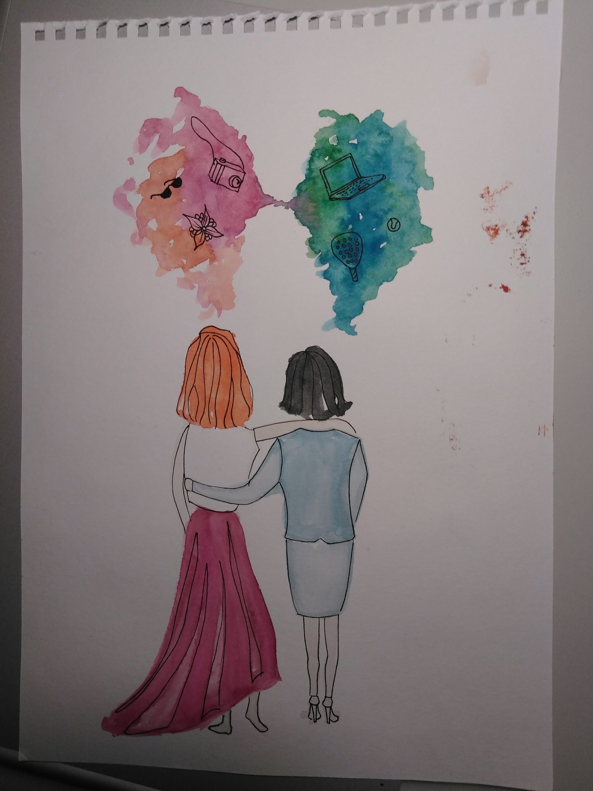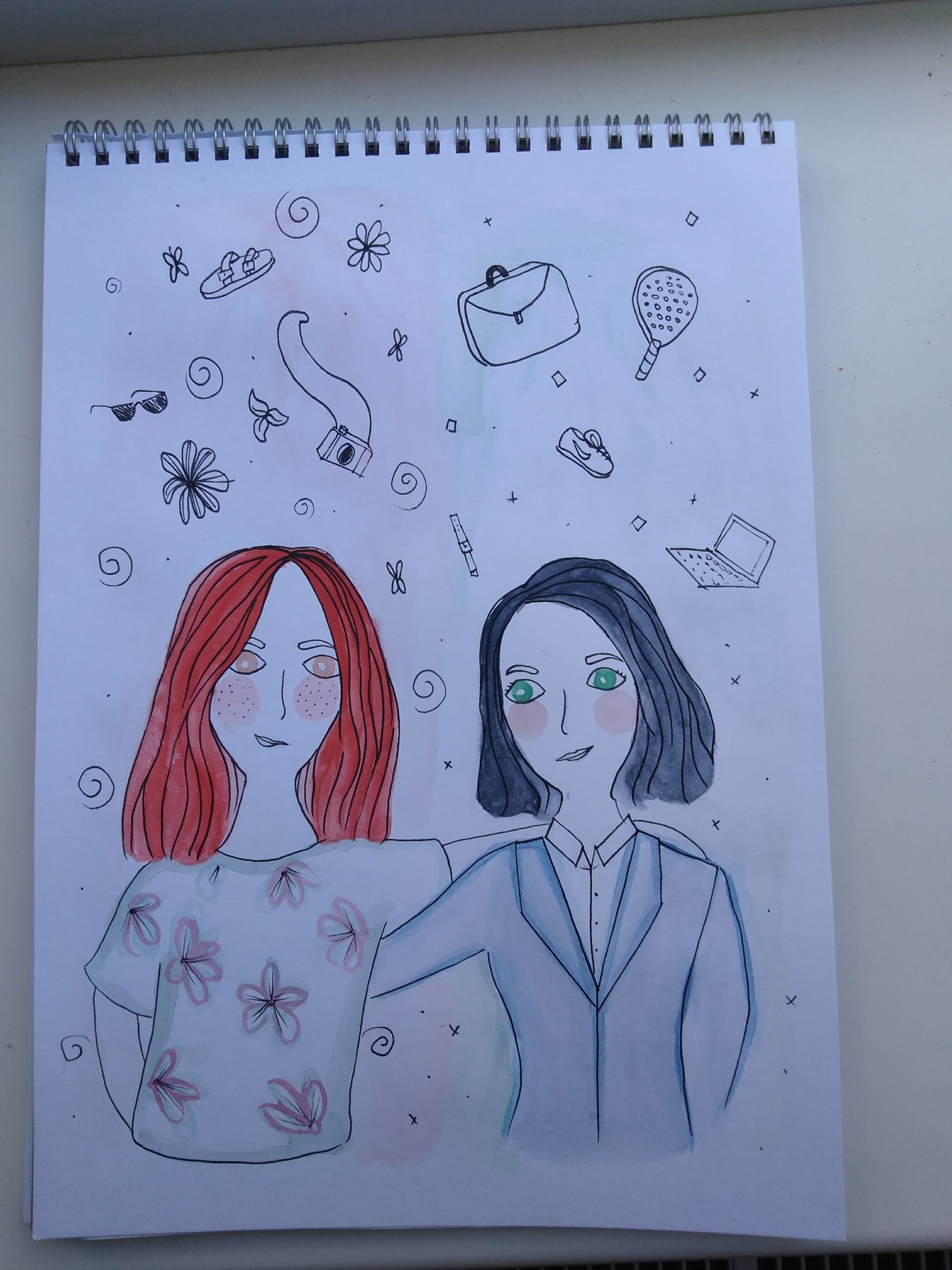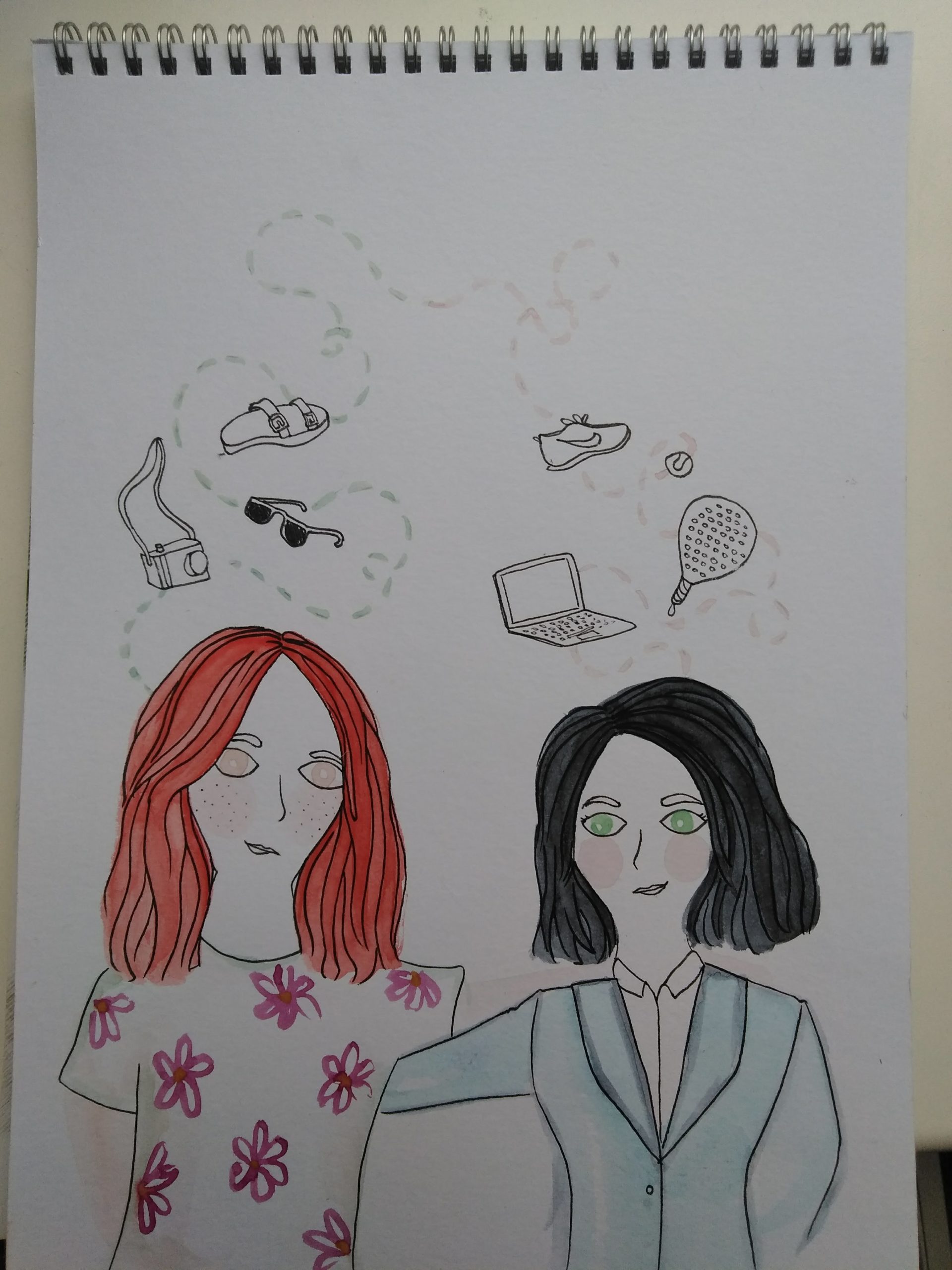 - Draw different objects that point out their differences, one with the laptop, rational, organized and sporty and the other one with a camera, flowers and comfy hippie shoes.