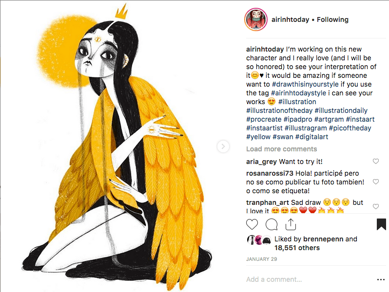 Few months ago I discovered this challenge that was going around artists on instagram called « Draw this in your Style ». Basically, the artist makes a drawing and you redraw it in your own style according to the artists rules. Some want you to keep the same pallet or expression and others give complete freedom as long as you tag them on your post.